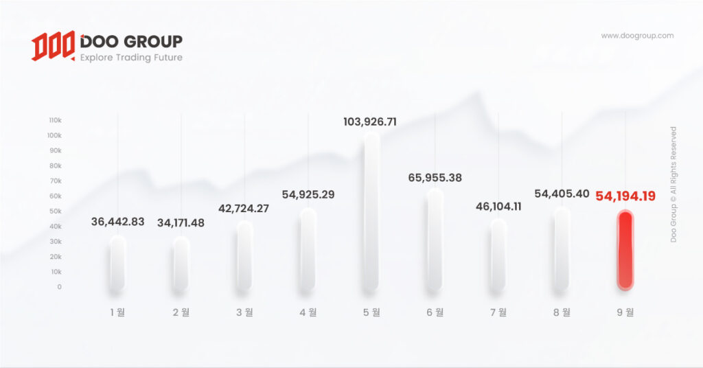 Doo Prime은 올해에 들어 거래량에서 꾸준한 상승세를 보이고 있습니다. 5월 총 거래량이 파격적으로 늘어났고 연중 거래량은 대체로 꾸준한 상승세를 유지하고 있습니다. 9월 거래량이 전월 대비 소폭 하락한 것은 달러화 가치 상승으로 관련 상품이 변동성이 커지면서 일부 투자자들이 변동장세를 최대한 피했기 때문으로 추정됩니다. 연초 이후 Doo Prime 총 거래량은 4,928.47억 달러로 지난해 같은 기간보다 123.86% 증가했습니다.