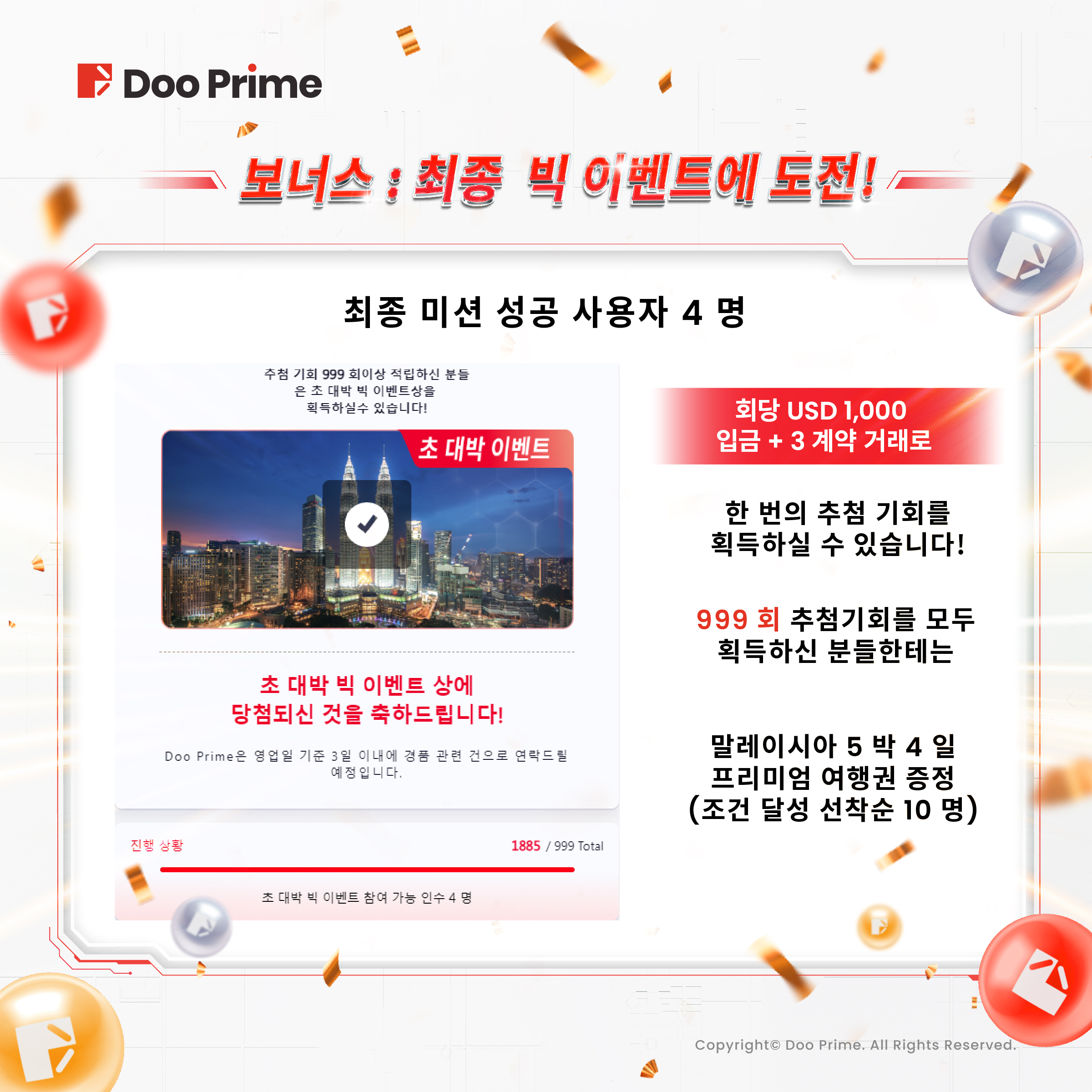 이번에 새로 추가된 맨유 콜라보 선물 외에도 고객님들에게 2중 서프라이즈를 선사하기 위한 최종 경품을 준비하였습니다. 누적 999회 추첨 기회 순차적 10명에게는 추가로 Doo Travel 말레이시아 4박 5일 프리미엄 여행 티켓이 증정됩니다. 현재 4명의 고객님이 최종 미션을 완료했으며 곧 이 놀라운 여정을 시작할 것입니다. 지금 바로 참여하셔서 최종 경품에 당첨되시고 함께 이 아름다운 거래의 여정을 떠나봅시다!