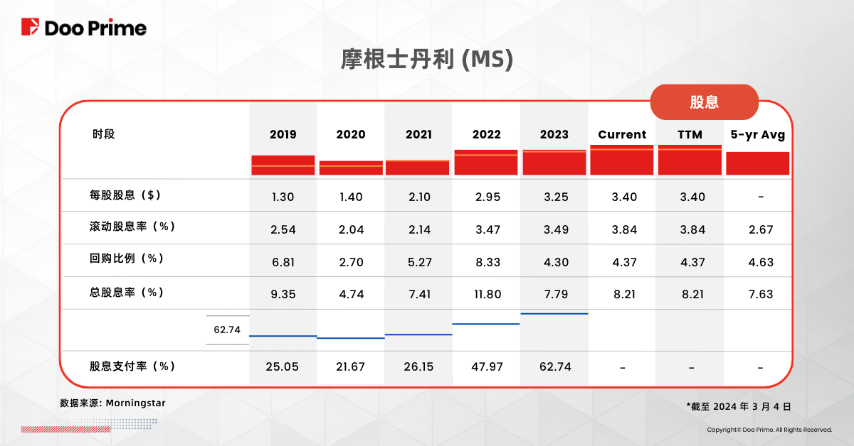 除了令人印象深刻的分红纪录,大摩还拥有坚实的财务基础。他们目前稳定提供 3.4% 左右的股息收益率,每股股息为 3.40 美元。依据过往的分红历史,从其高股息率和持续增长的模式,可以发现大摩致力于实现股东回报和财务稳定。