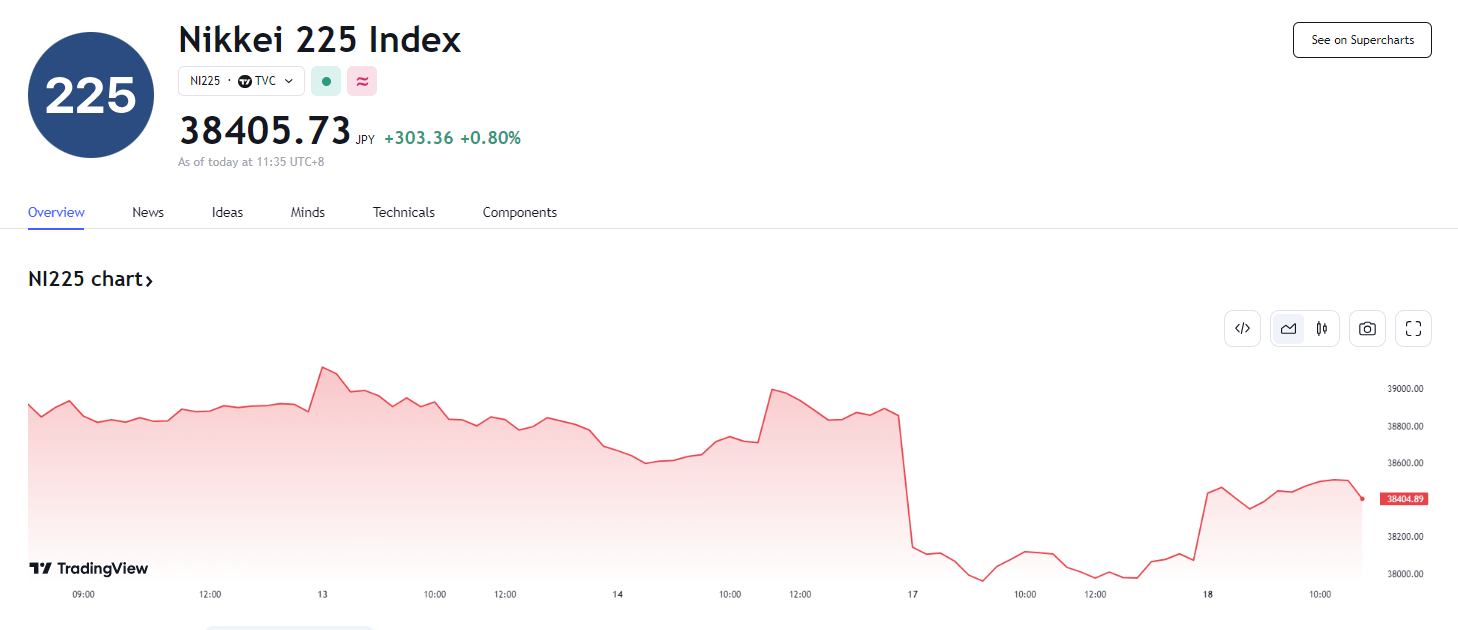 日本股市低开低走,日经 225 指数跌幅一度超过 2%,最低至 37950.20 点。截至当天收盘,日经 225 指数下跌 712.12 点,报 38102.44 点,跌幅 1.83%;日本东证股指下跌 46.60 点,报 2700.01 点,跌幅 1.70%。