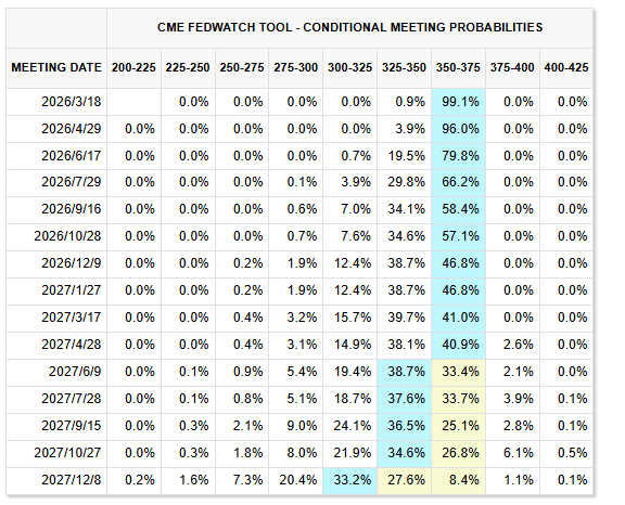 根据芝加哥商品交易所(CME)FedWatch 工具数据显示,在冲突爆发之前,市场普遍预期美联储 6 月将降息 25 个基点,9 月可能再度降息,甚至有小概率全年降息三次。然而近期价格走势显示,投资者已明显下调对宽松政策的押注,有关“更高利率维持更久”的预期再度回升。