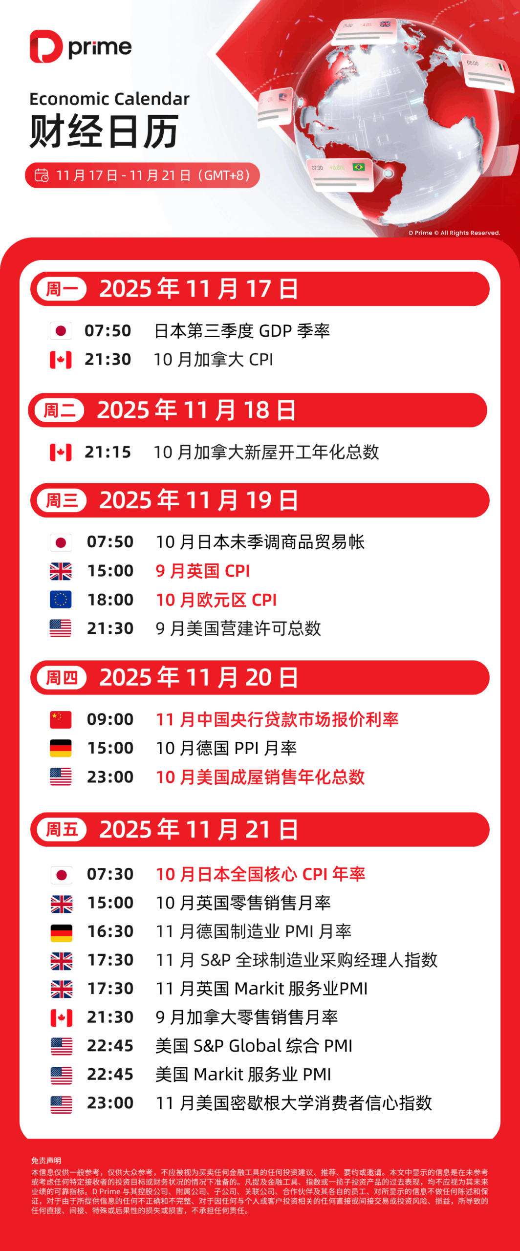 财经日历 | 以下为 2025 年 11 月 17 日至 2025 年 11 月 21 日(GMT+8 北京时间) 全球重大经济事件提醒。在重大行情期间,请确保您已审查您的保证金率,并有足够的保证金来支撑您的风险敞口。