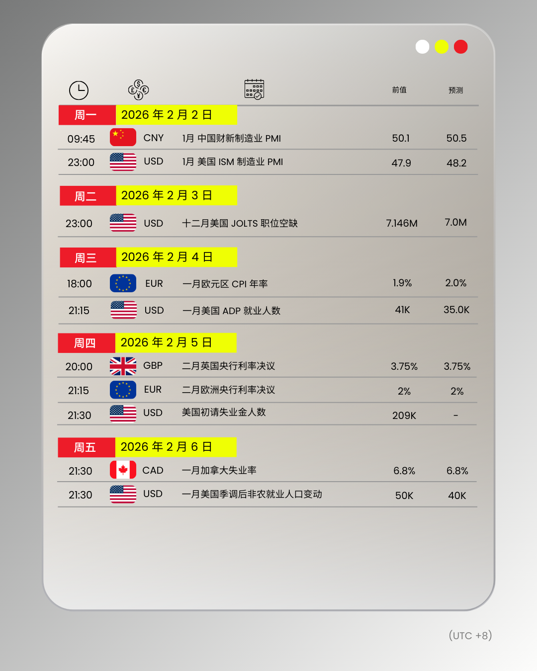 财经日历 | 以下为 2026 年 2 月 2 日至 2026 年 2 月 6 日(GMT+8 北京时间) 全球重大经济事件提醒。在重大行情期间,请确保您已审查您的保证金率,并有足够的保证金来支撑您的风险敞口。
