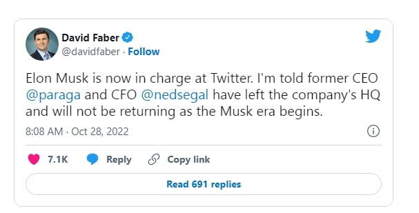 10 月 27 日,马斯克一上任就血洗管理层,多名推特高管均被解雇。马斯克完成收购后的首个举措便是解雇首席执行官 Parag Agrawal、首席财务官 Ned Segal 和法律政策、信托和安全负责人 Vijaya Gadde,该公司的总法律顾问 Sean Edgett 也被赶走。 CNBC 记者 David Faber 在推特透露,Parag Agrawal 和 Ned Segal 已离开公司位于旧金山的总部。
