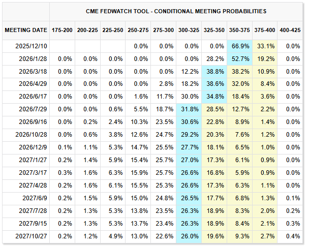 根据芝商所(CME)FedWatch 工具,交易员目前认为美联储在 12 月会议上降息 25 个基点的概率为 66.9%,预期已成为黄金与贵金属上涨的重要支撑因素。