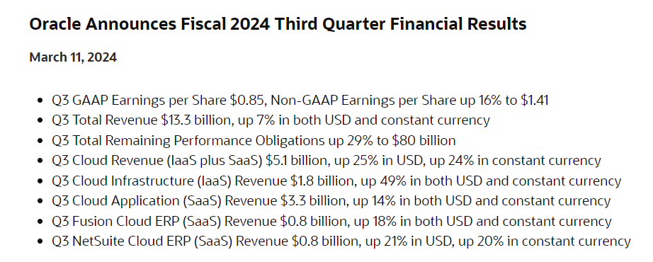 甲骨文公布 2024 财年第三财季业绩,数据显示其第三季度营收为 133 亿美元,同比增长 7.1%,符合市场预期;调整后每股收益为 1.41 美元,好于市场预期的 1.38 美元。