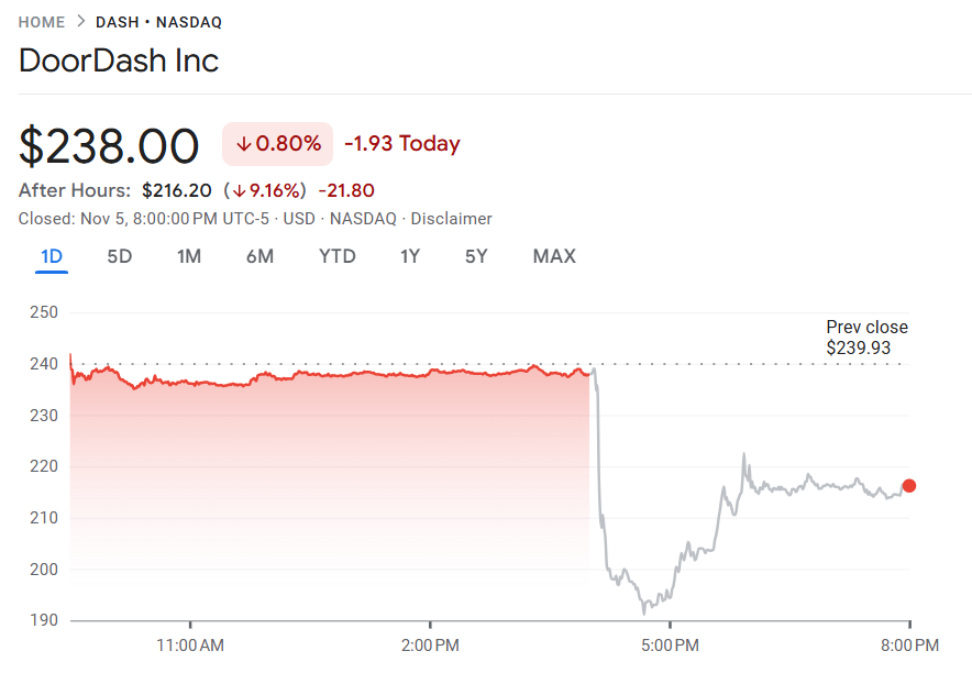 尽管季度营收与订单表现强劲,投资者对扩张支出持保留态度,DoorDash 股价在盘后交易中暴跌 9%。