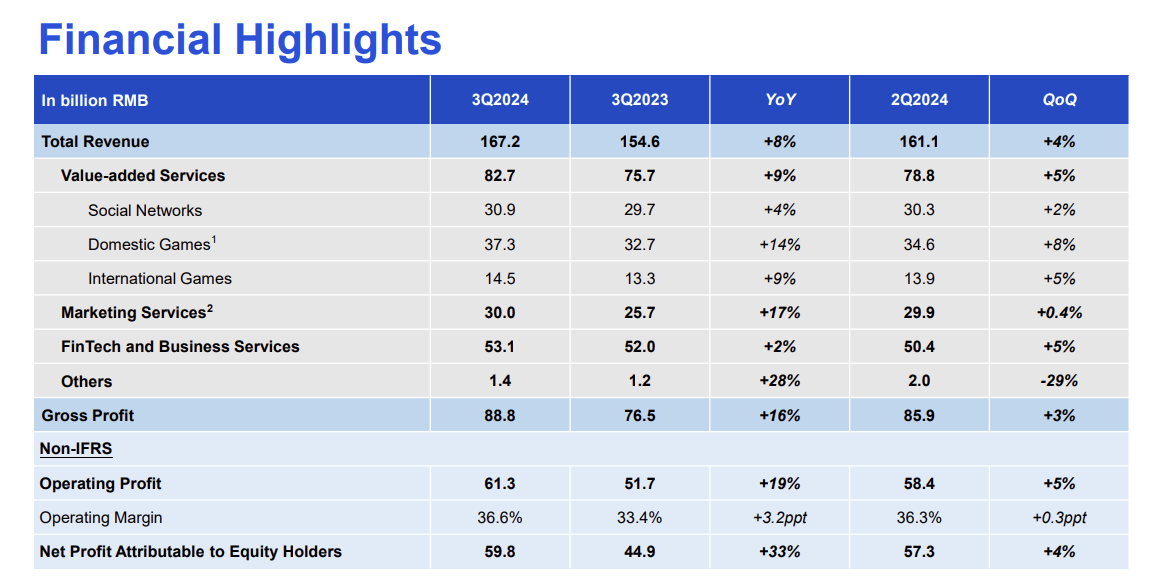 - 增值服务营收同比增长 9%,达到 827 亿元,占总收入的 49%;主要得益于手游虚拟产品销售、音乐付费会员以及小游戏平台服务费的增长;