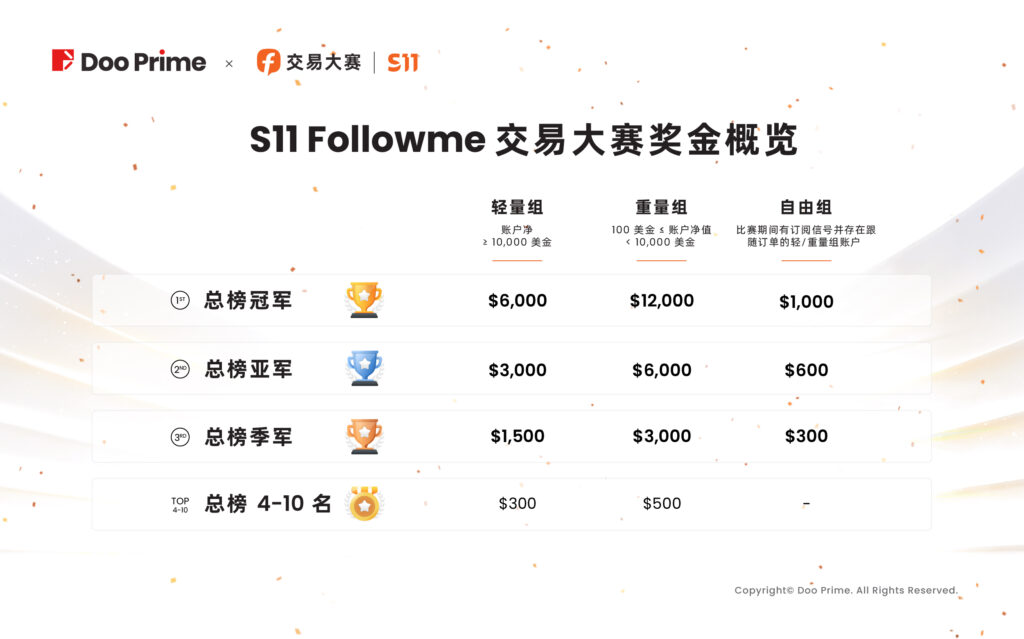 与此同时,我们也祝愿广大 Doo Prime 用户能在接下来的 S11 赛程中越战越勇,在各组别中继续发光发亮,让  FOLLOWME 交易大赛成为您踏足世界交易舞台的基石,使您满怀信心及勇气与全球顶尖交易高手同场比拼!