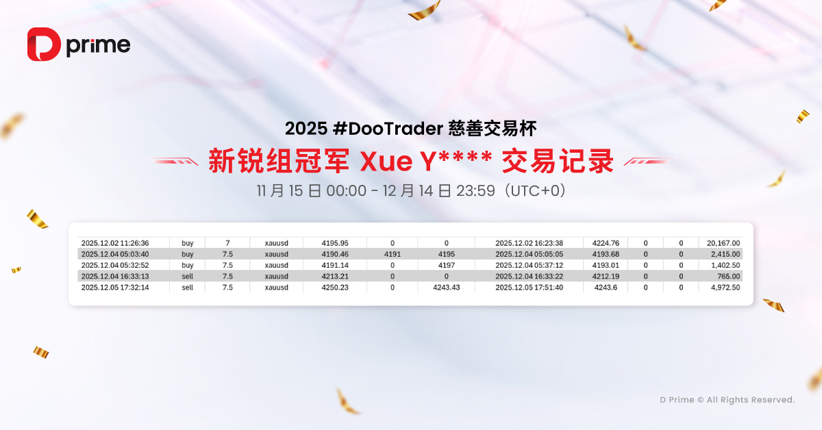 值得关注的是,2025 #DooTrader 慈善杯交易杯不仅是一场较量,更是一个传递爱心的公益活动。每当您在比赛中完成 1 手交易,D Prime 都将代表您捐出 0.1 美元,帮助改善贫困儿童的教育条件,让您的每一笔交易助力点亮更多孩子的未来。