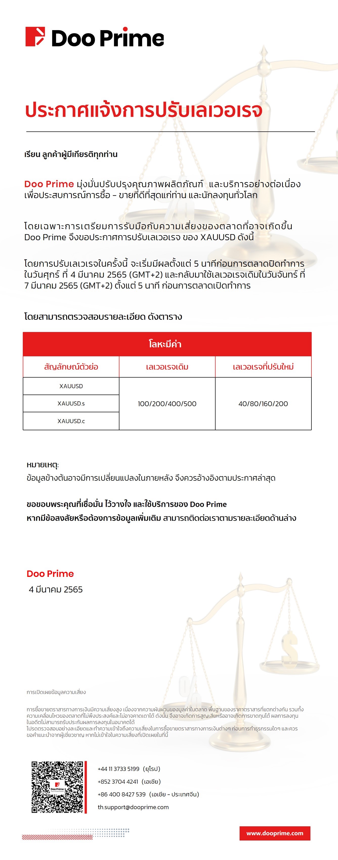 Doo Prime ประกาศแจ้งการปรับเลเวอเรจ