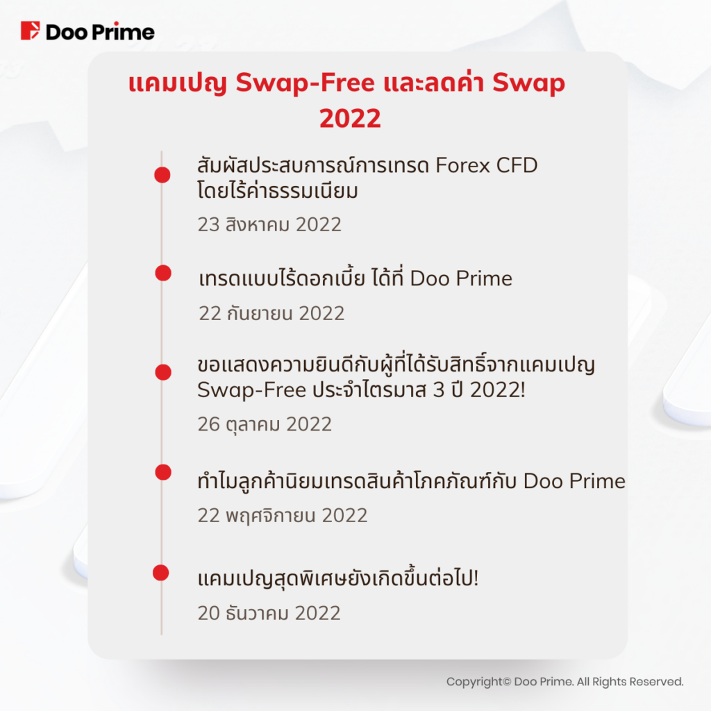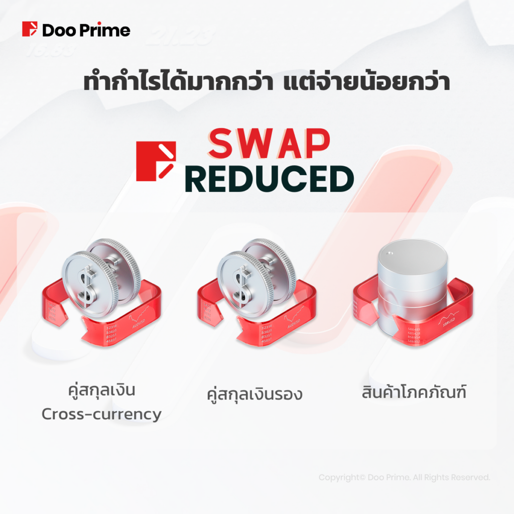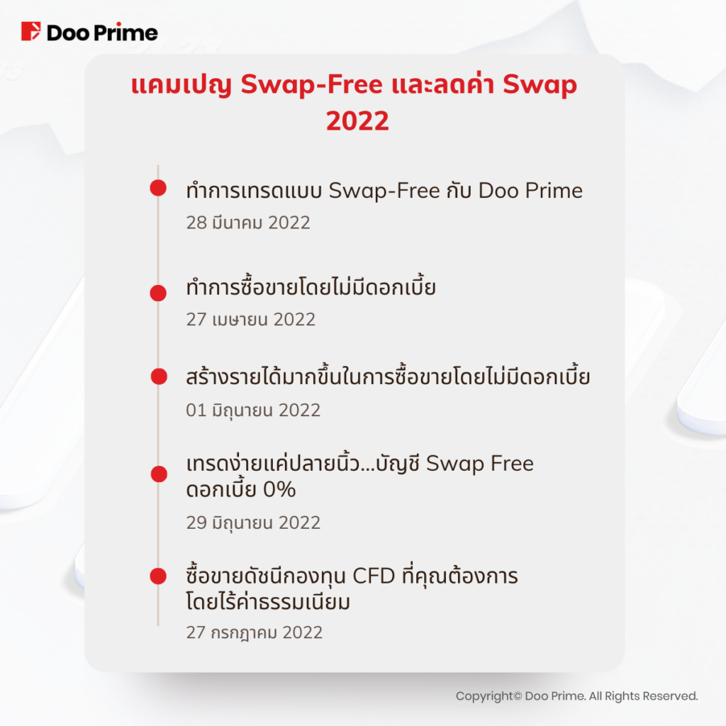 Doo Prime ได้เปิดตัวแคมเปญต่างๆ และกิจกรรมมากมาย แคมเปญหนึ่งที่เป็นที่นิยมและเป็นประโยชน์ต่อลูกค้าคือ “แคมเปญ Swap Free และลดค่า Swap” ซึ่งเป็นโอกาสที่จะให้โอกาสลูกค้าในการเทรดสินค้าบางประเภทโดยมีโปรโมชันลดค่า Swap รวมถึงไม่ต้องเสียค่า Swap เลยด้วย!