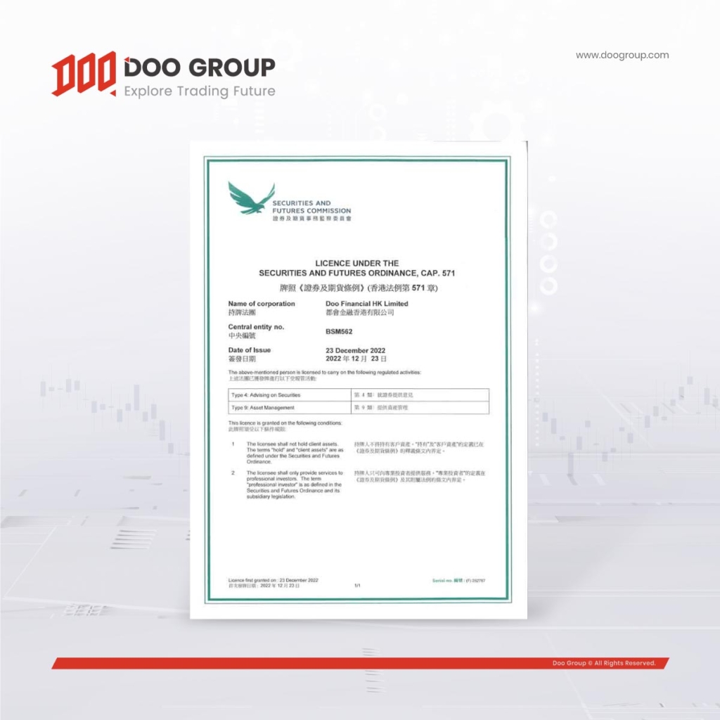 Công ty trực thuộc của Tập đoàn Doo Group – Doo Financial HK Limited (Mã số trung tâm thương hiệu: BSM562), vừa đánh dấu một cột mốc quan trọng khi chính thức được cấp Giấy phép Loại 4 (Tư Vấn Chứng Khoán) và Loại 9 (Quản Lý Tài Sản) bởi Ủy Ban Chứng Khoán Và Hợp Đồng Tương Lai Hồng Kông (HK SFC).